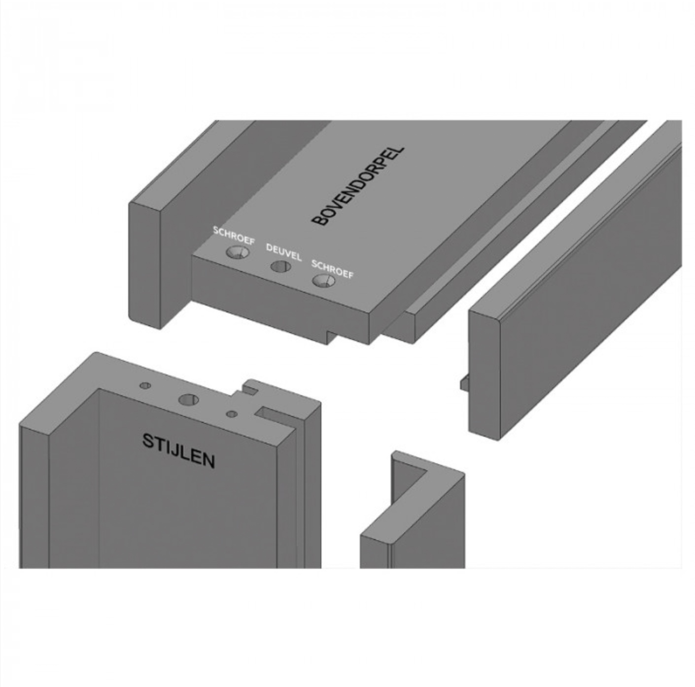 Pakket bestaat uit: 2 stijlen (2700 mm), 1 bovendorpel, montagemateriaal en handleiding.