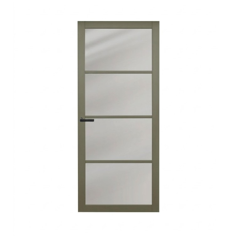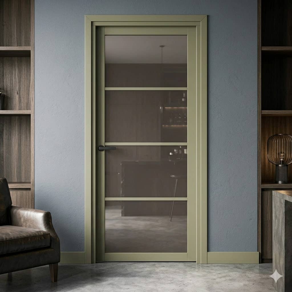 De Nero Legno Chiari Tinto in Olijf Grijs is een verfijnde binnendeur die de industriële staallook combineert met een warme, organische uitstraling. In plaats van hard zwart, biedt de olijfgrijze tint een zachte, aardse nuance die rust brengt in het interieur.