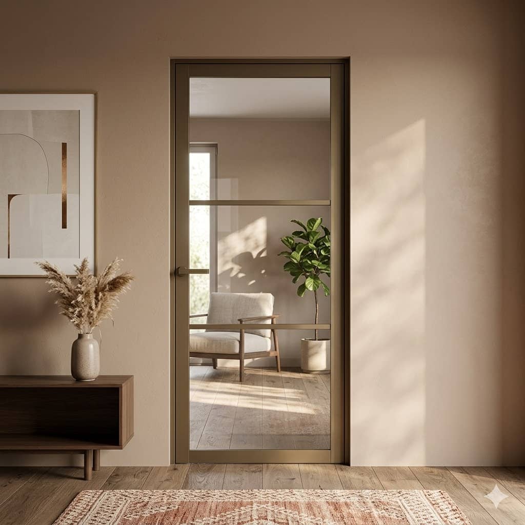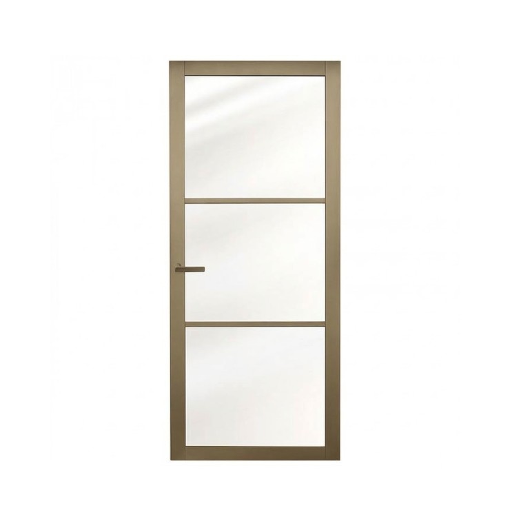 De Nero Legno Champagne Brons is een verfijnde binnendeur die de strakke “steel look” combineert met een warme, luxe uitstraling. In plaats van standaard zwart, biedt de champagne bronzen finish een zachte metallic glans die prachtig kleurt bij natuurlijk licht.