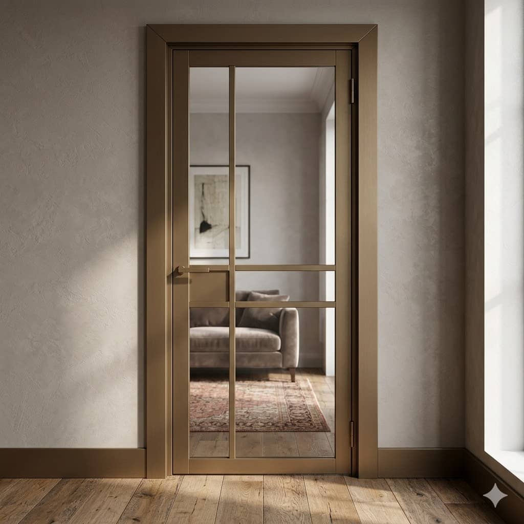 De Nero Legno Champagne Brons is een verfijnde binnendeur die de strakke “steel look” combineert met een warme, luxe uitstraling. In plaats van standaard zwart, biedt de champagne bronzen finish een zachte metallic glans die prachtig kleurt bij natuurlijk licht.