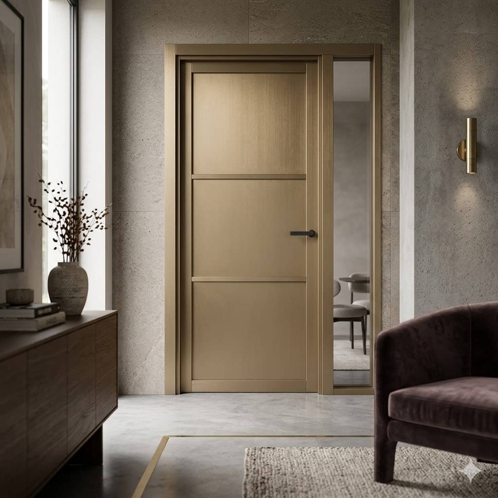 De Nero Legno Livorno in de kleur Champagne Brons is een verfijnde binnendeur die een perfecte balans vindt tussen industrieel design en luxe elegantie. Waar standaard zwarte deuren vaak een stoer accent geven, brengt de champagne-bronzen afwerking een warme, tijdloze zachtheid in het interieur.