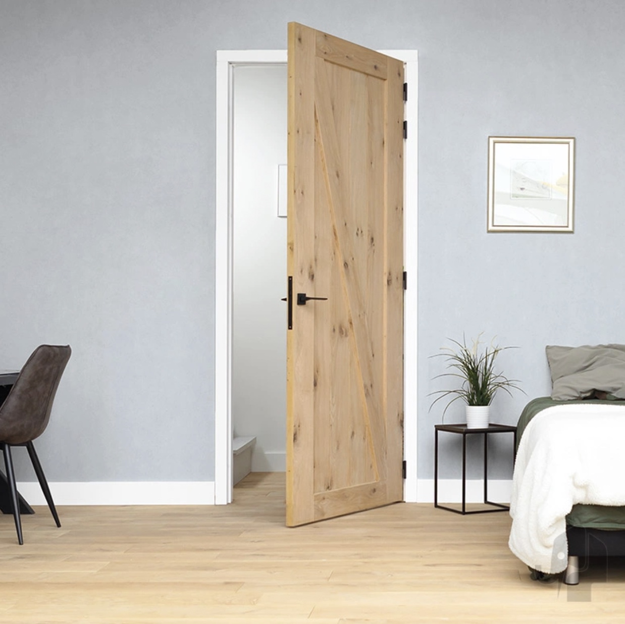 De binnendeur Cabana Roble Uno Links uit de Cabana Roble collectie heeft stijlen van onbehandeld rustiek eikenfineer, wat zorgt voor een tijdloze en natuurlijke uitstraling. Deze deuren passen perfect in een modern interieur en zijn eenvoudig te combineren met andere modellen uit de collectie. De Roble Uno deuren zijn uitsluitend verkrijgbaar in een stompe uitvoering en worden geleverd met onbewerkt fineer. Het is belangrijk om de deur af te werken met een blanke lak voor bescherming en een langdurig mooie afwerking.