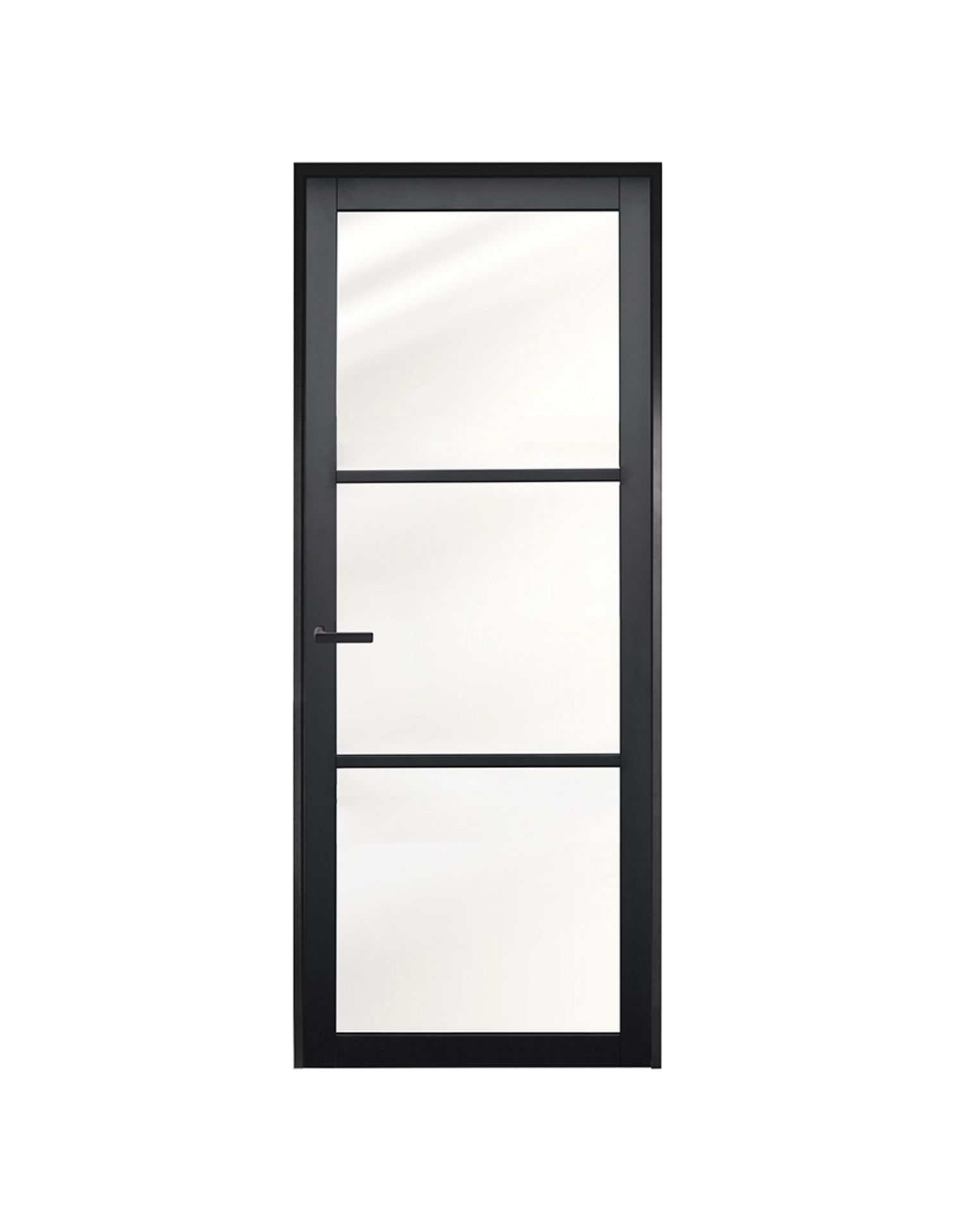 De deur is hoogwaardig zwart RAL9005 afgelakt en opgebouwd uit massieve stijlen en dorpels met een HDF toplaag. De kozijn is eveneens hoogwaardig zwart RAL9005 afgelakt, geschikt voor wanden ± 10 cm dik. Het kozijn kan vanwege de flexibele deurlijsten kleine afwijkingen zonder consequenties voor de bestaande wand in de wanddikte opvangen.