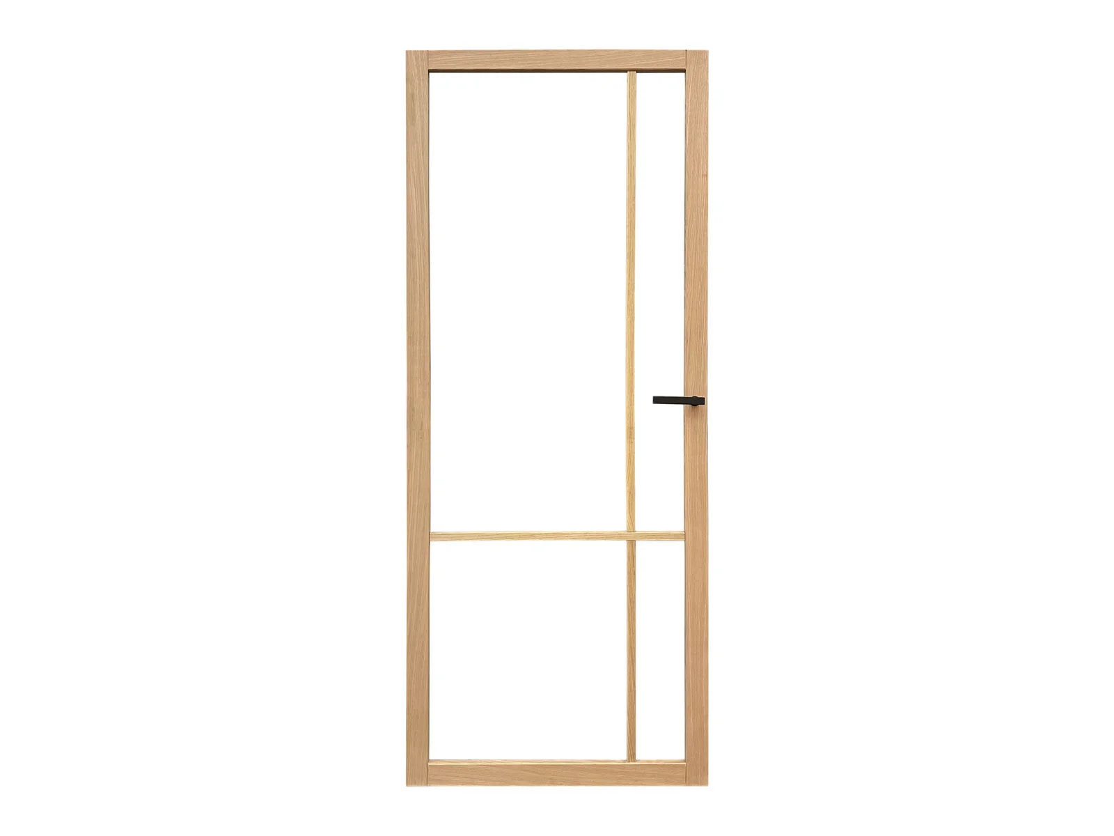 De Eiken binnendeur Varik met blank glas heeft strakke profielen en smalle roeden, gecombineerd met helder veiligheidsglas. Dit geeft de deur een trendy, industriële uitstraling die kenmerkend is voor deze deuren. De deur is 40 mm dik en je kan zelf bepalen welke design je wilt aanhouden. Eiken plakroedes meegeleverd; u kunt kiezen uit een horizontale of asymmetrische vlakverdeling.