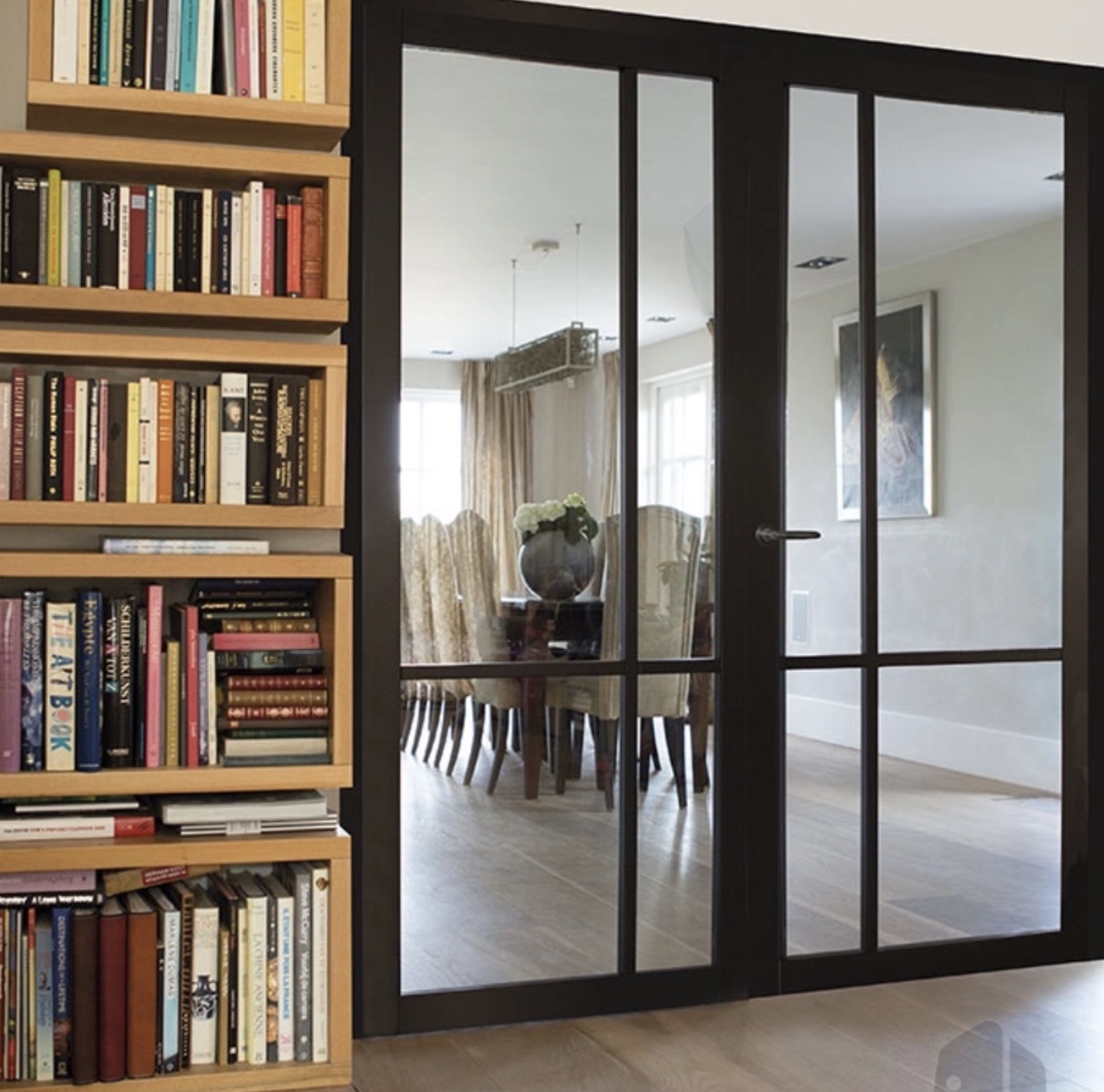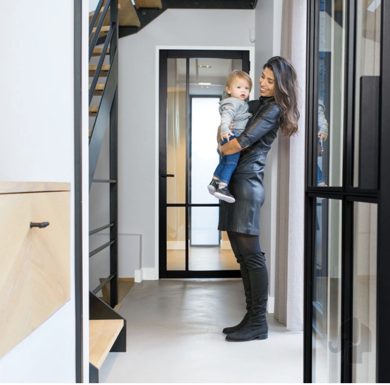 De Maatwerk Nero Legno Asti industriële binnendeur heeft strakke profielen en smalle roeden, gecombineerd met helder/mat veiligheidsglas. Dit geeft de deur een trendy, industriële uitstraling die kenmerkend is voor de Nero Legno-collectie. De deurstijlen zijn 80 mm breed en de roeden 30 mm, zwart (RAL9005) of wit (RAL9010) grondverf.
