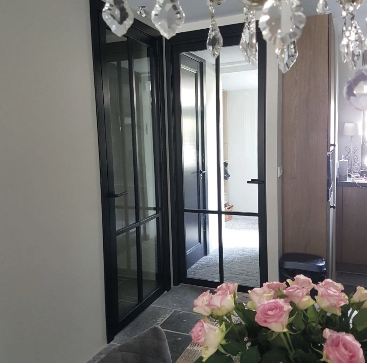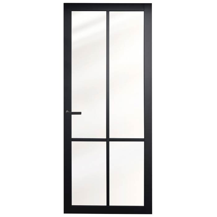 De Maatwerk Nero Legno Brescia industriële binnendeur heeft strakke profielen en smalle roeden, gecombineerd met blank of mat veiligheidsglas. Dit geeft de deur een trendy, industriële uitstraling die kenmerkend is voor de Nero Legno-collectie. De deurstijlen zijn 80 mm breed en de roeden 30 mm, zwart (RAL9005) of wit (RAL9010) gegrond geleverd.