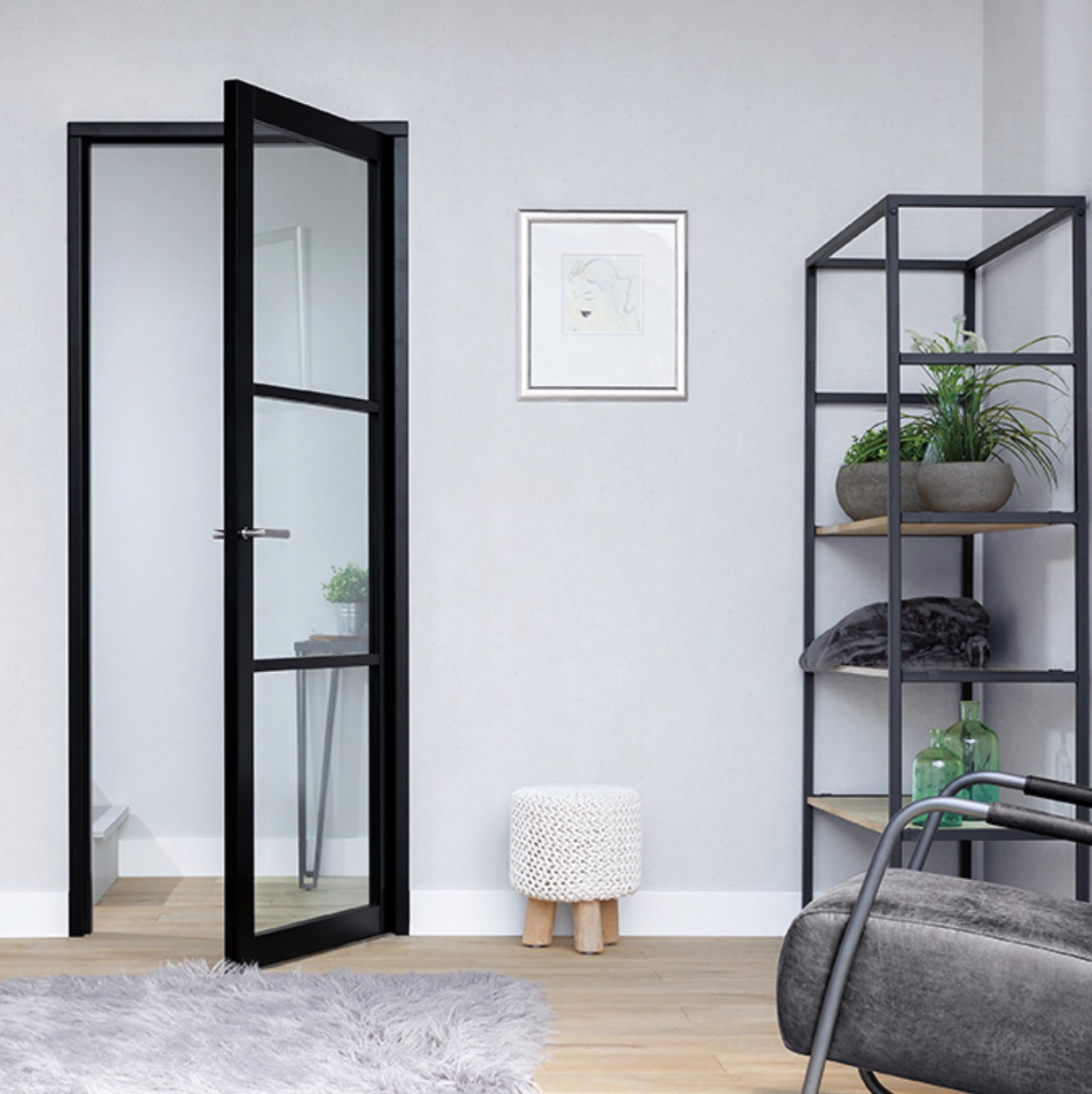 De Maatwerk Nero Legno Genova industriële binnendeur heeft strakke profielen en smalle roeden, gecombineerd met blank of mat veiligheidsglas. Dit geeft de deur een trendy, industriële uitstraling die kenmerkend is voor de Nero Legno-collectie. De deurstijlen zijn 80 mm breed en de roeden 30 mm, zwart (RAL9005) of wit (RAL9010) gegrond.