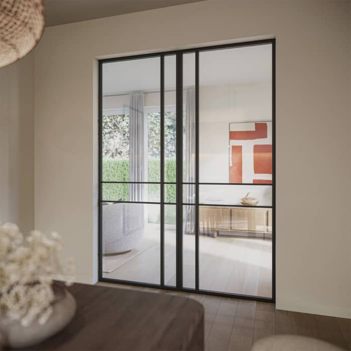 De deur kan zowel als enkele of dubbele schuifdeur worden toegepast en is standaard voorzien van een voorgemonteerde zwarte schuifkom. Voor een complete look kies je het bijpassende schuifdeursysteem Lima XS in zwart of aluminium.