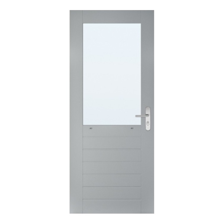 De deur is voorzien van 3 stapeldorpels van 40 cm hoog, heeft extra brede stijlen van 140 mm, een dikte van 40 mm en wordt afgewerkt in grijze grondverf. Ook beschikt de deur over 2 ventilatiegleuven voor optimale werking.