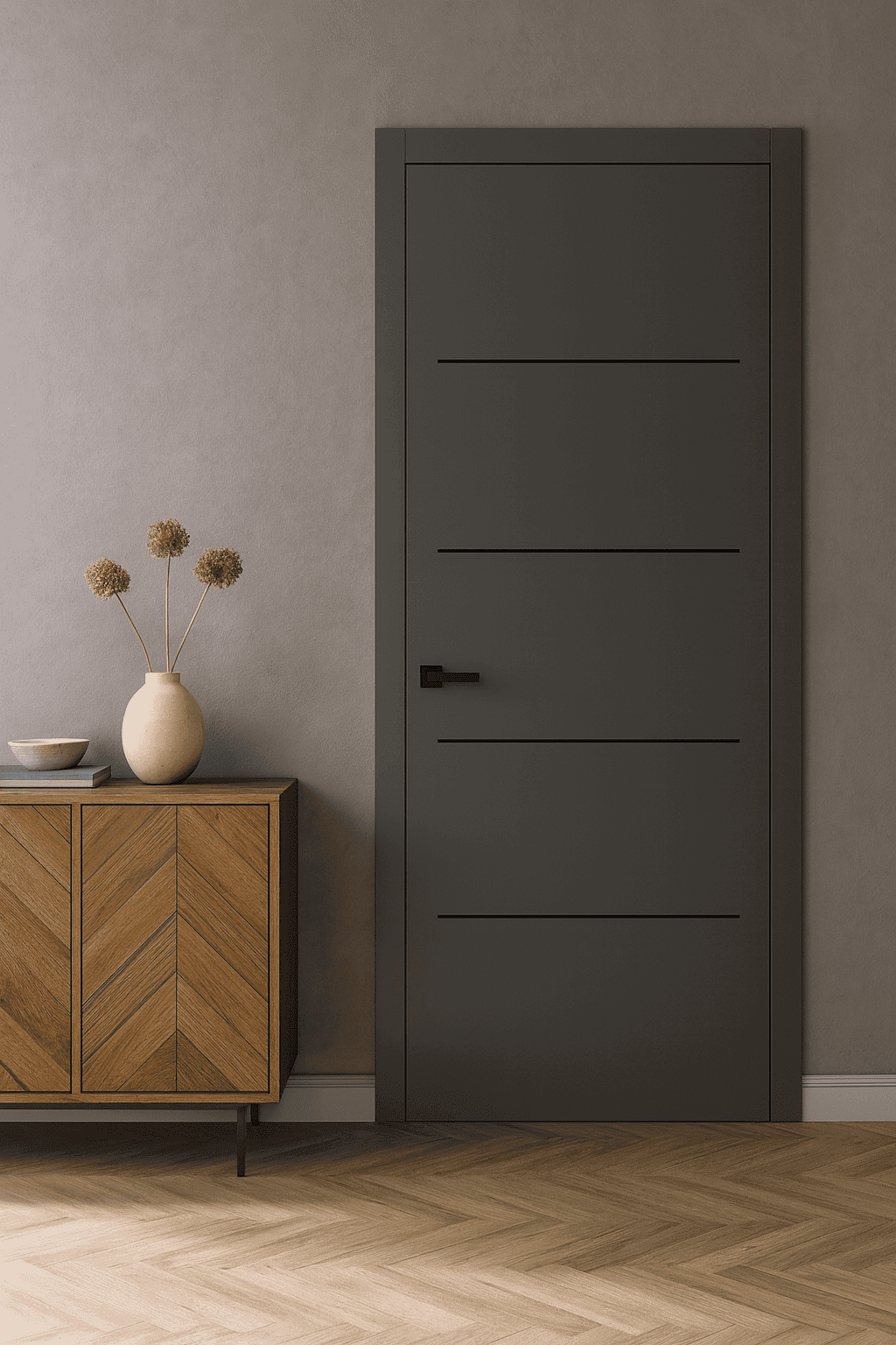 De deuren uit de Skantrae Nano TopCoat collectie zijn strak vormgegeven, duurzaam afgewerkt en direct klaar voor montage. Dankzij het geavanceerde EBC-lakproces zijn deze deuren krasvast, makkelijk schoon te maken en voorzien van een sterke laklaag in RAL 7043 mat grijs.