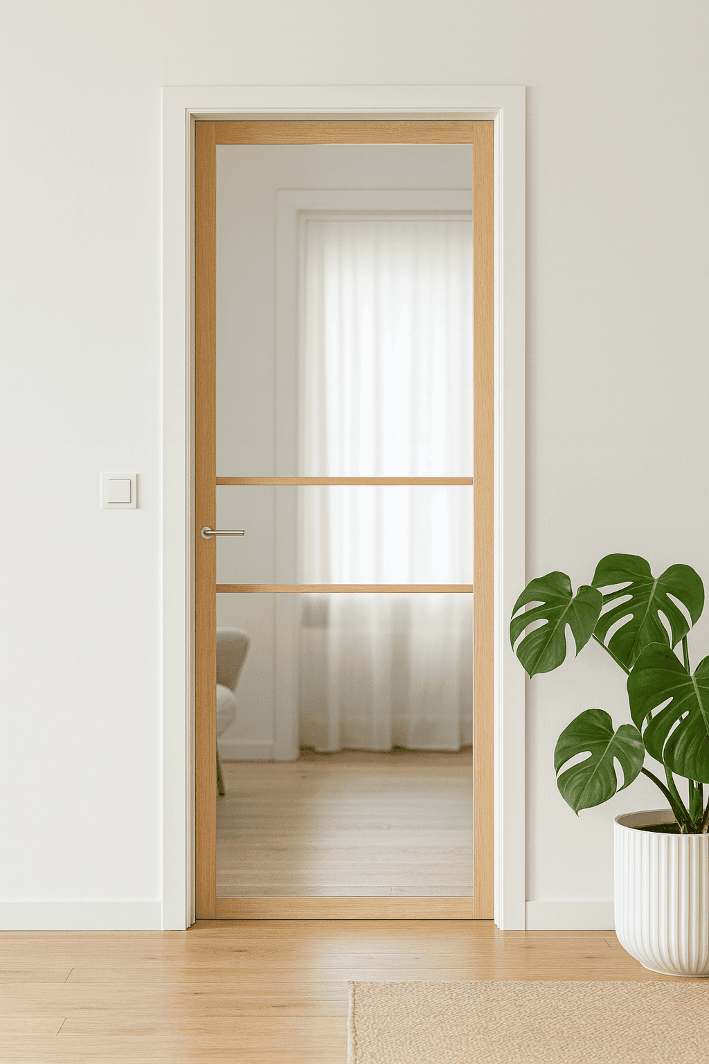De SSL 14810 uit de Skantrae SlimSeries One is een strak vormgegeven binnendeur met voorgemonteerd blank 8 mm veiligheidsglas. Dankzij de smalle stijlen (6 cm bij stomp, 7,3 cm bij opdek) en fijne roedes van 2 cm heeft deze deur een elegante, moderne uitstraling.