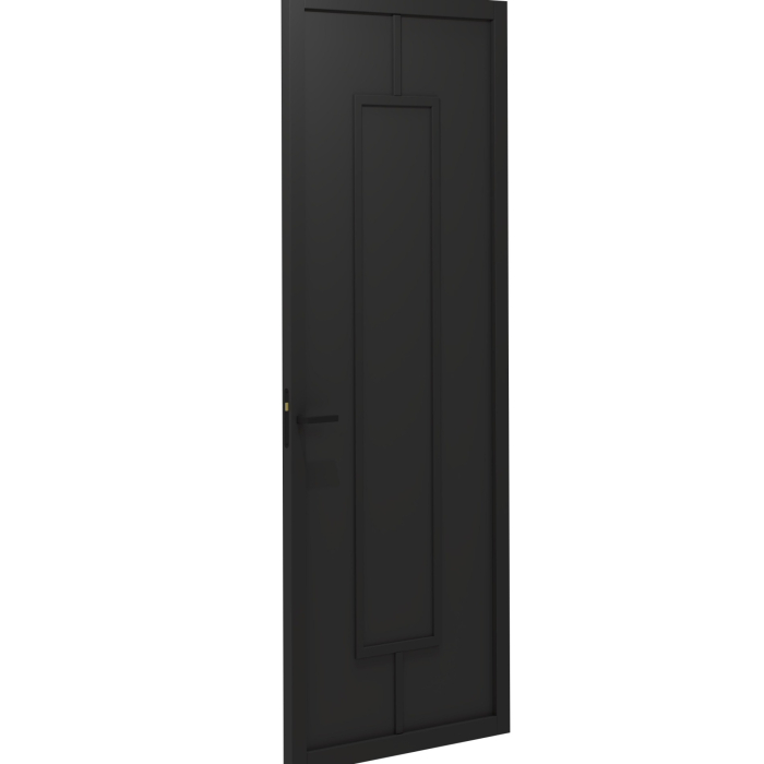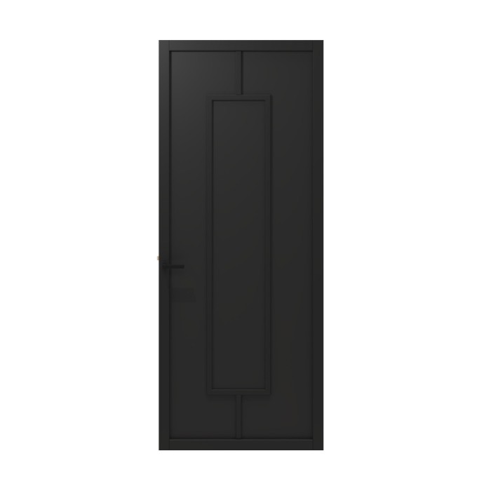 De deur is voorzien van een strak vlak paneel (12 mm) en haakse profielen voor een minimalistische uitstraling. Dankzij de slanke deurstijlen (60 mm bij stomp, 73 mm bij opdek) sluit deze perfect aan bij moderne meubels en verlichting. En met een dikte van 39 mm voelt de deur stevig en degelijk aan.