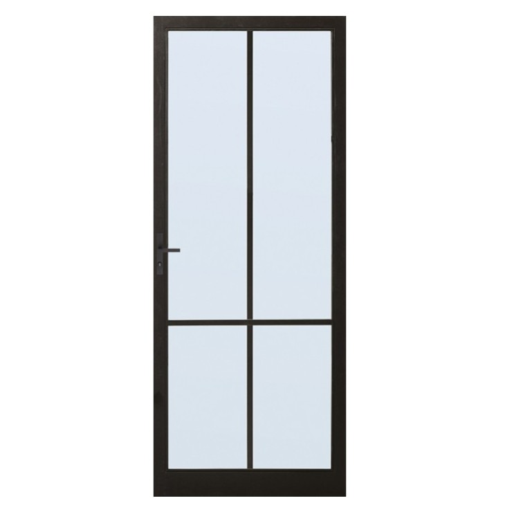 Deze buitendeur is 40 mm dik, afgewerkt in zwarte grondverf (RAL 9011 benaderend) en wordt geleverd met gemonteerd veiligheids-isolatieglas en montagevoorschrift. Let op: inkorten is niet mogelijk, maar maatwerk wél.