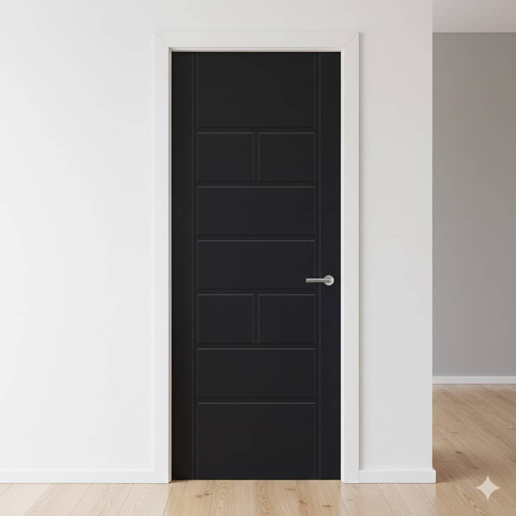 De Svedex FR555 zwart is een moderne lijndeur uit de Front collectie, uitgevoerd in diep zwart (RAL9005) met een verfijnd patroon van 24 mm vlakke lijnfrezingen. Een stijlvolle keuze voor een strak en industrieel interieur.