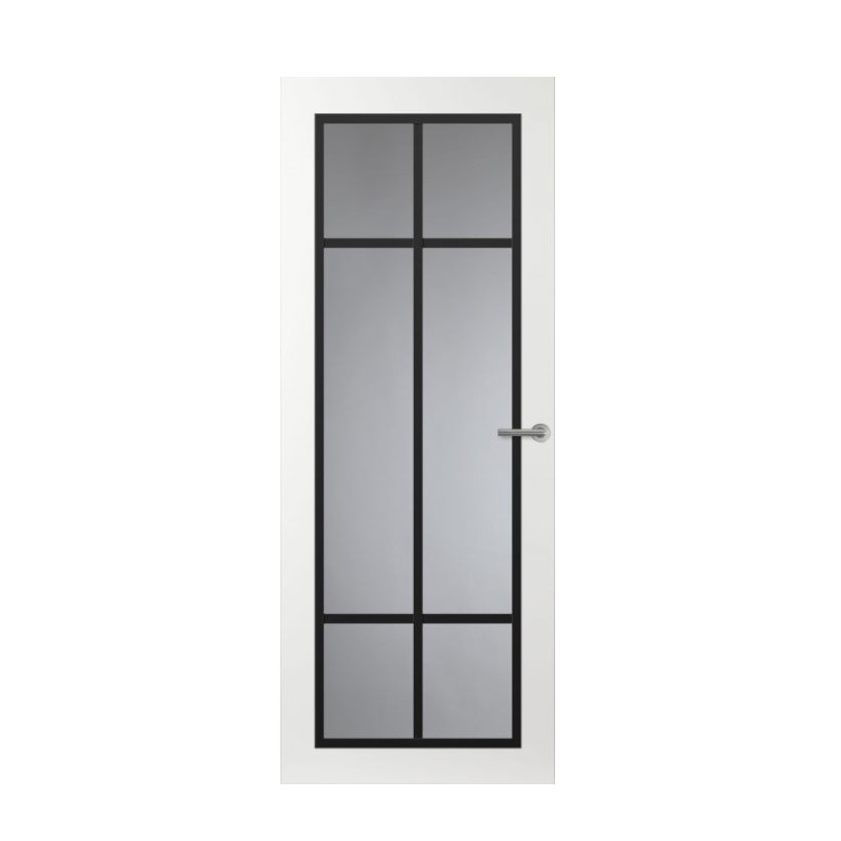 De Svedex FR513Z is een moderne glasdeur uit de Front collectie, met een uniek asymmetrisch lijnenspel van zwarte glaslatten. Deze speelse en stijlvolle deur is verkrijgbaar in Alpine wit (standaard) of Extra wit, en past perfect in een eigentijds interieur.