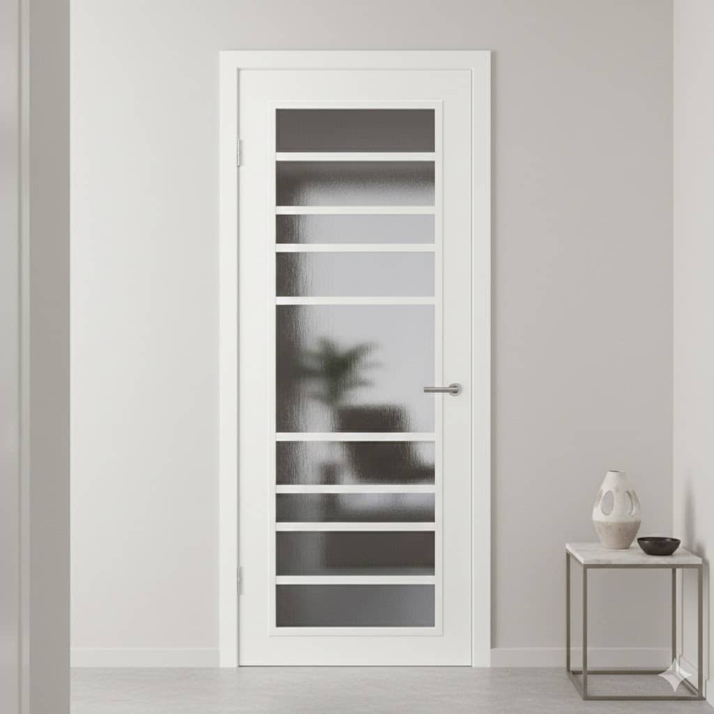 Glaslatten zijn geïntegreerd in het design, waardoor glas en deur één naadloos geheel vormen.