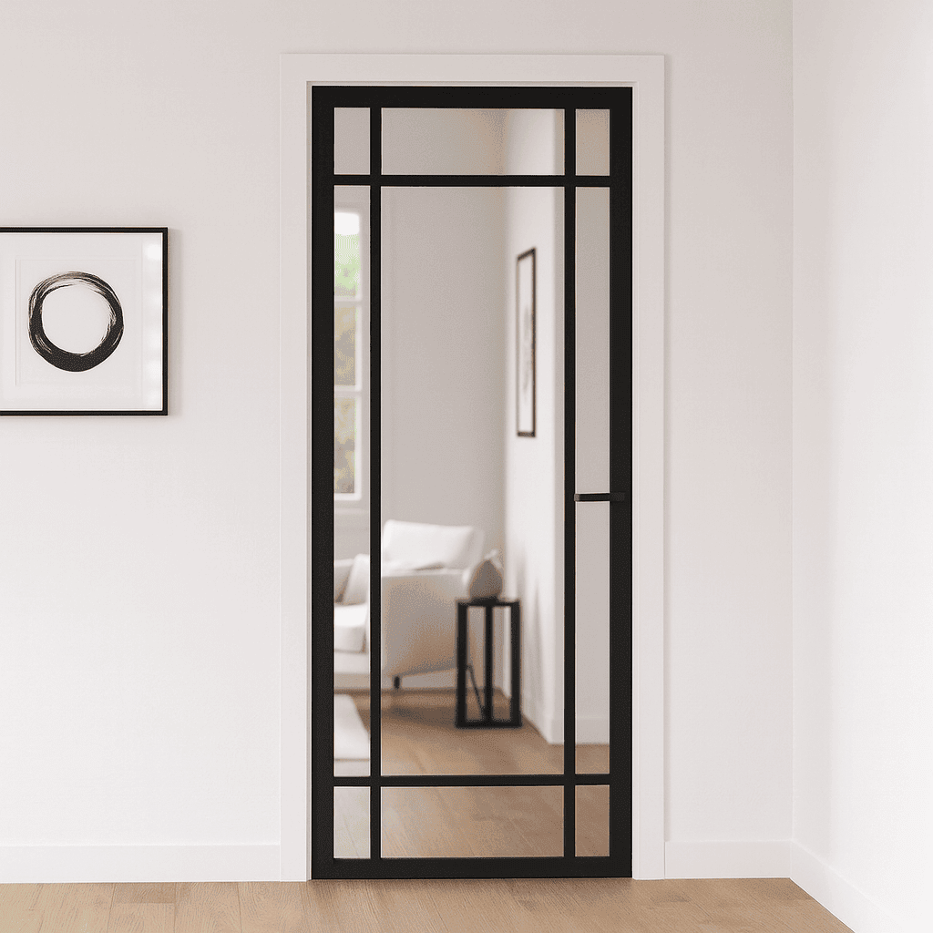De Svedex Nova Design NDB907 zwart is een elegante industriële deur, zwart afgelakt (RAL9005), met een glasvlak voorzien van een verticale roedeverdeling voor een strak en eigentijds uiterlijk. Deze deur wordt standaard geleverd met een loopslot en is beschikbaar met 4 soorten veiligheidsglas. Voor een stijlvol geheel kiest u een Nova deurklink zoals Enter, Close of Air.