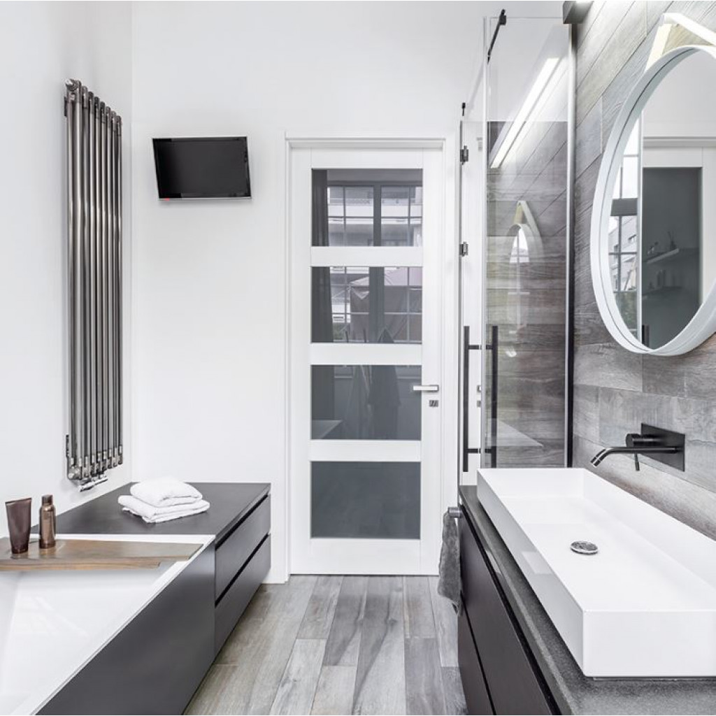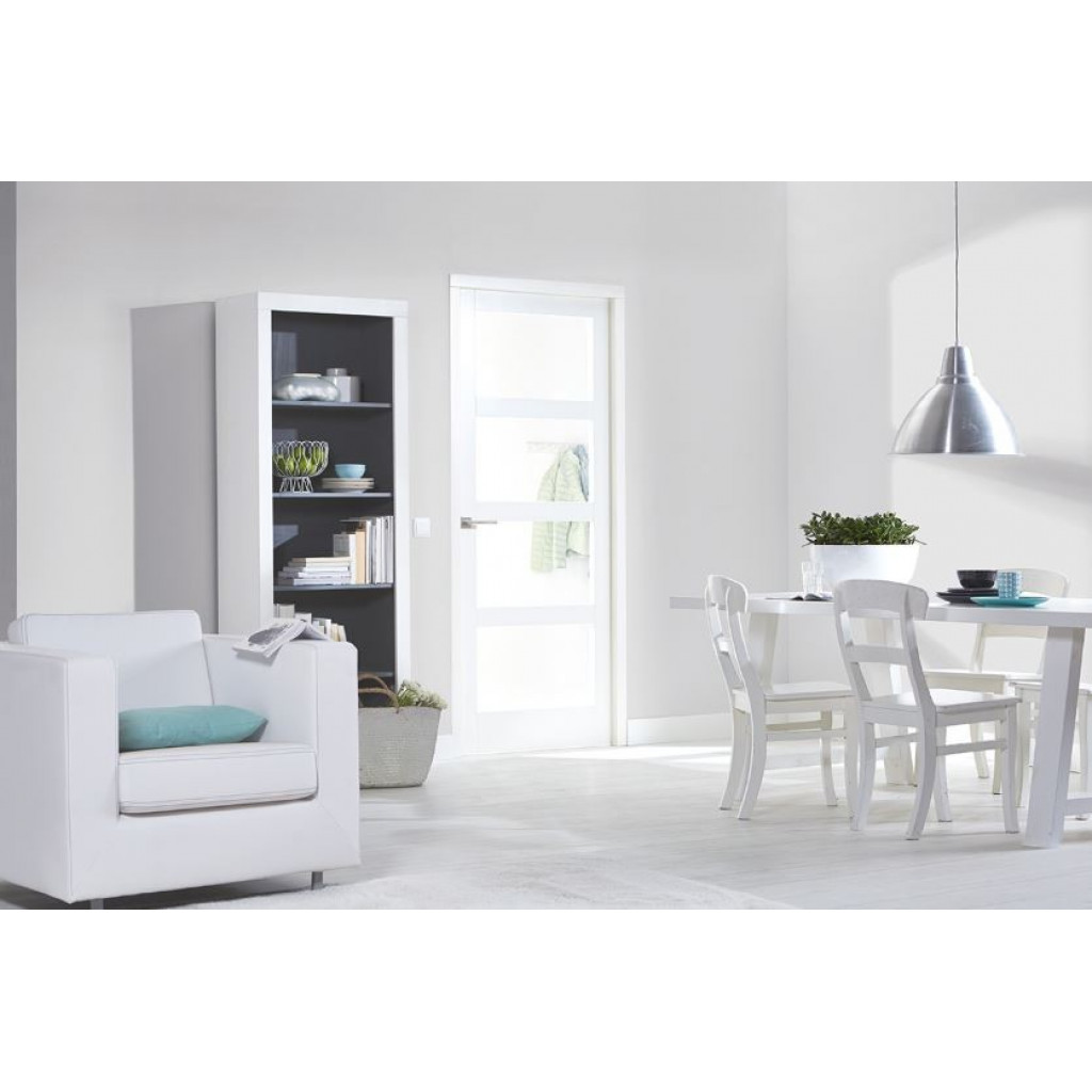 De deur heeft 5 mm gehard blank glas, fabrieksmatig gemonteerd zonder zichtbare glaslatten. Glasroeden zijn 90 mm breed voor een strak design. Daarnaast zijn alle bewerkingen al uitgevoerd, de deur is arm geschaafd, wit afgelakt en geplaatst met tochtrubbers, een magneetpot, en slotgat- en voorplaatboring voor een 1200 magneetslot (loop- of vrij/bezet slot)
