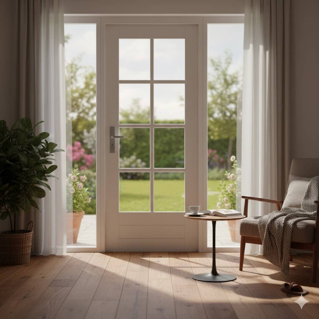 Hardhouten terrasdeur met 8 ruitsverdeling en klassieke houten roedes. Keuze uit een schuin facet of rond kraalprofiel. Leverbaar in alle afmetingen en ook als dubbele uitvoering. Voorzien van blank isolatieglas of isolatieveiligheidsglas.