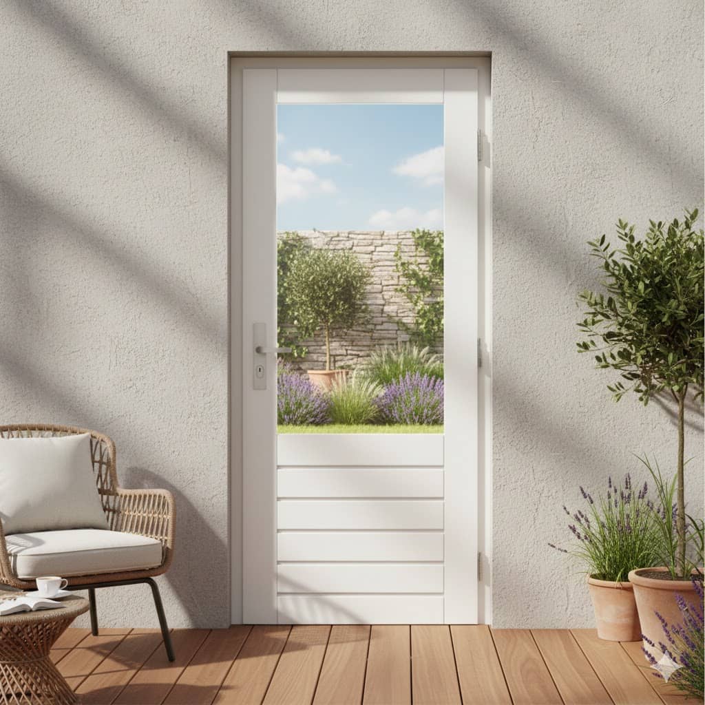 Hardhouten terrasdeur met keuze uit een schuin facet of klassiek kraalprofiel. Leverbaar in alle maten en ook als dubbele openslaande deur. Mogelijk met helder isolatieglas of isolerend veiligheidsglas. Standaard wit voorbehandeld en af te lakken in elke gewenste kleur, eventueel binnen en buiten verschillend. Diverse glassoorten mogelijk.