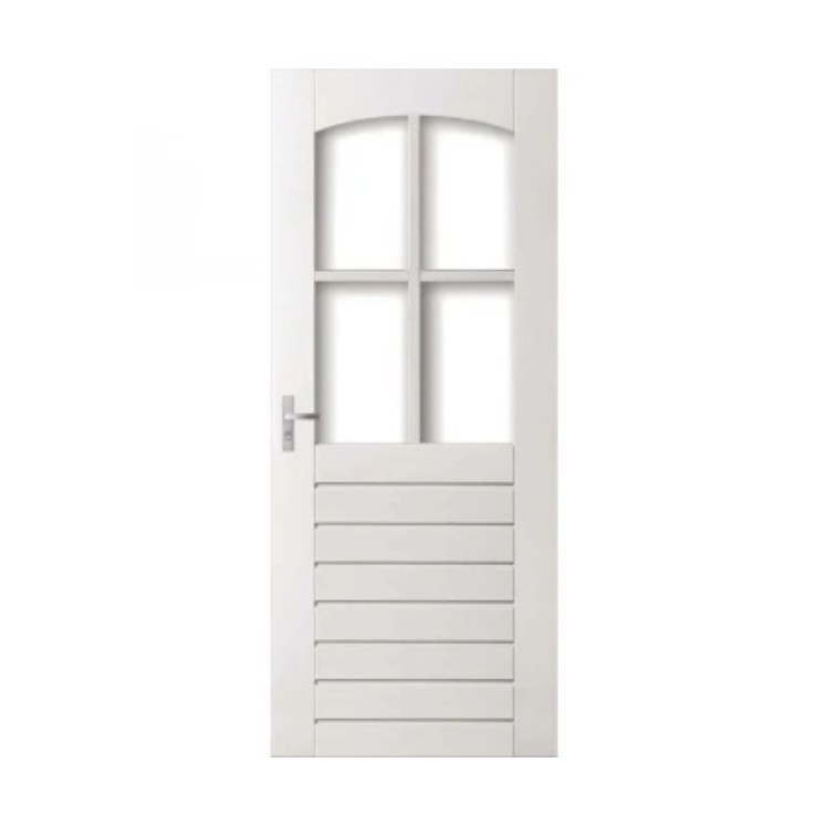 Hardhouten terrasdeur met sierlijke toog en 4-ruits indeling, uitgevoerd met traditionele houten roedes. Keuze uit een schuin facetprofiel of klassiek rond kraalprofiel. Leverbaar in elke maat, ook als dubbele deur. Geschikt voor blank isolatieglas of isolatieveiligheidsglas.