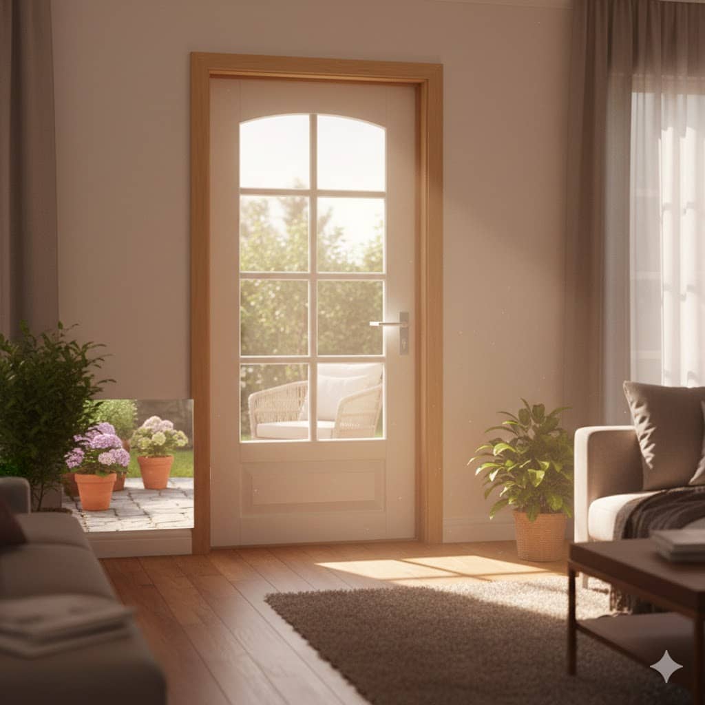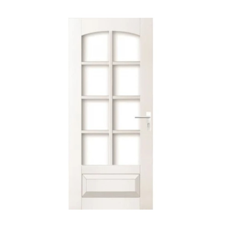 Hardhouten terrasdeur met Zaanse toog, 8-ruitsindeling en onderpaneel, afgewerkt met traditionele houten roedes. Verkrijgbaar met schuin facet of klassiek rond kraalprofiel, in elke maat en ook als dubbele uitvoering. Te leveren met helder isolatieglas of isolatieveiligheidsglas.