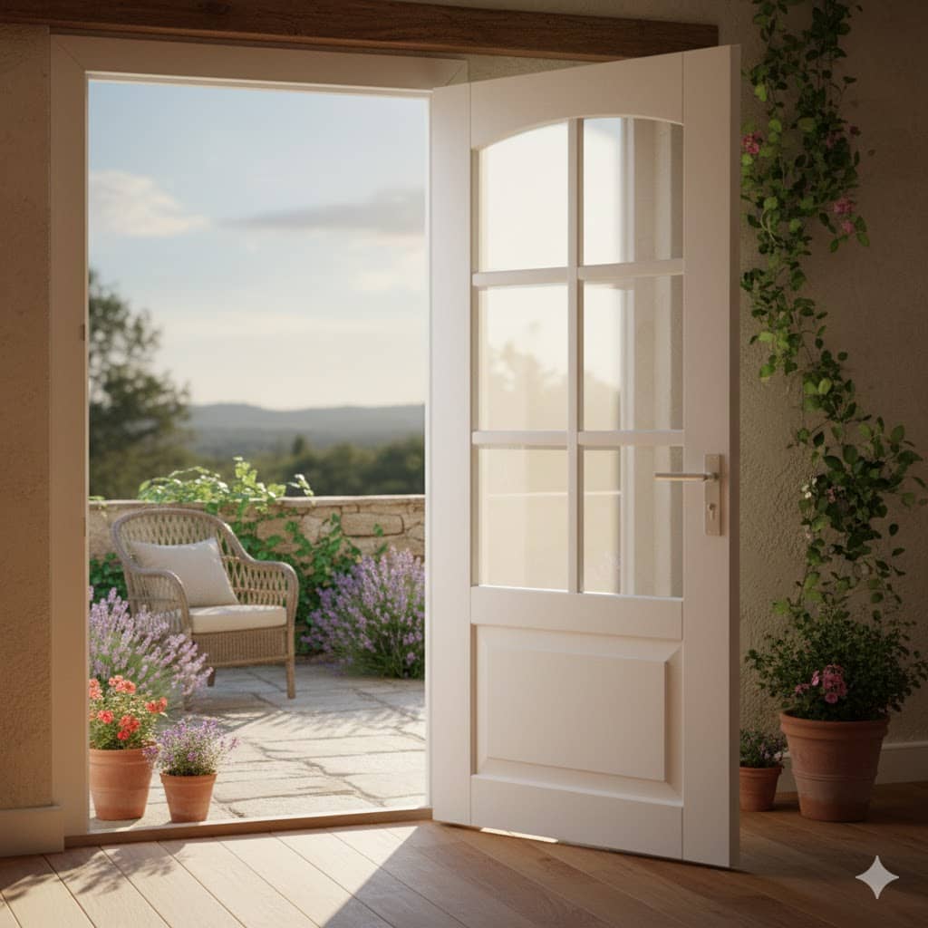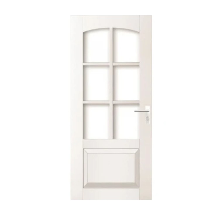 Hardhouten terrasdeur met karakteristieke Zaanse toog, voorzien van een 6-ruitsverdeling en paneel met traditionele houten roedes. Leverbaar met schuin facet of klassiek rond kraalprofiel, in elke maat en ook als dubbele uitvoering. Geschikt voor blank isolatieglas of isolatieveiligheidsglas.