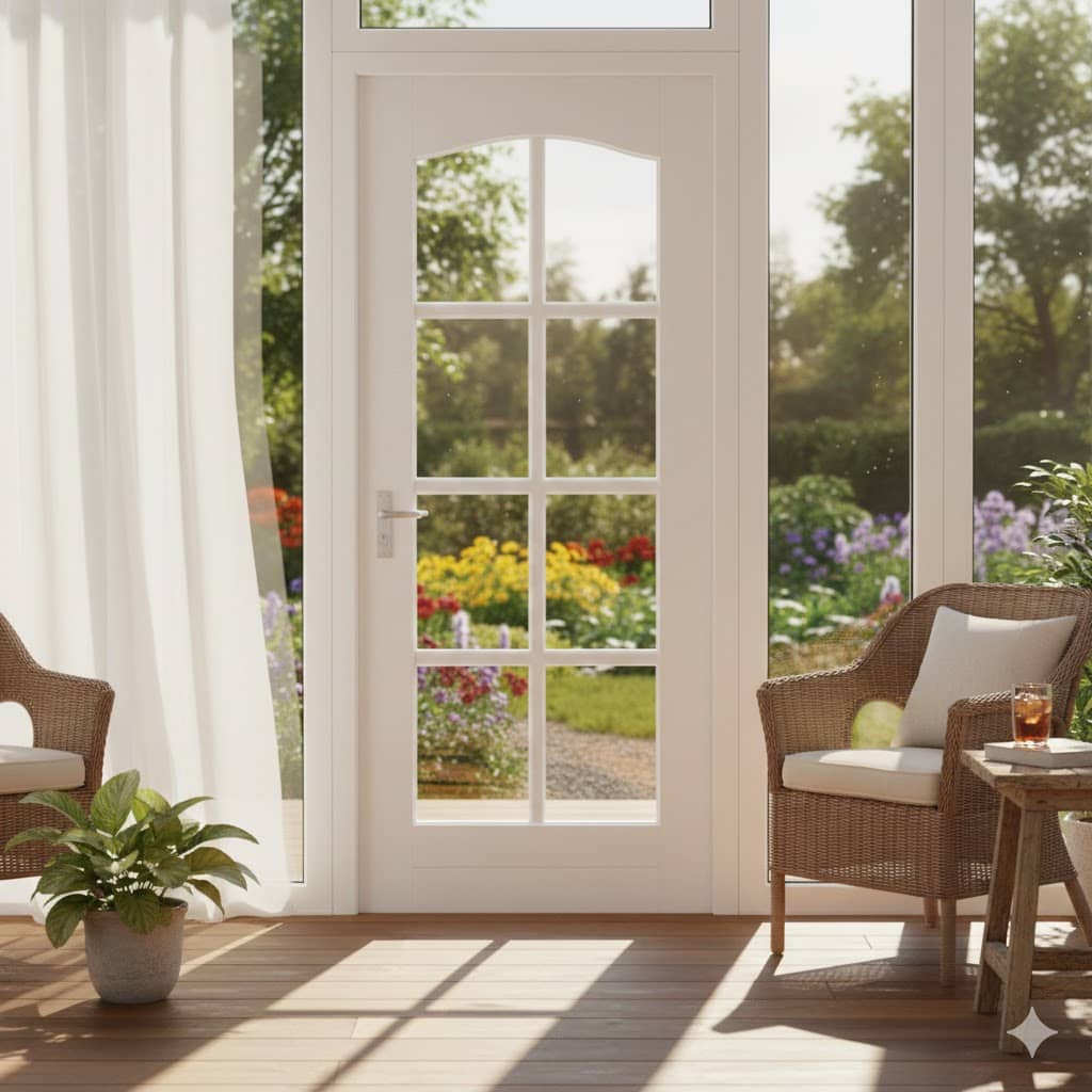 Hardhouten terrasdeur met karakteristieke Zaanse toog en 8-ruitsverdeling, voorzien van traditionele houten roedes. Leverbaar in elke maat, ook als dubbele deur. Keuze uit facet of klassiek kraalprofiel en diverse glassoorten, waaronder helder isolatieglas of isolatieveiligheidsglas.