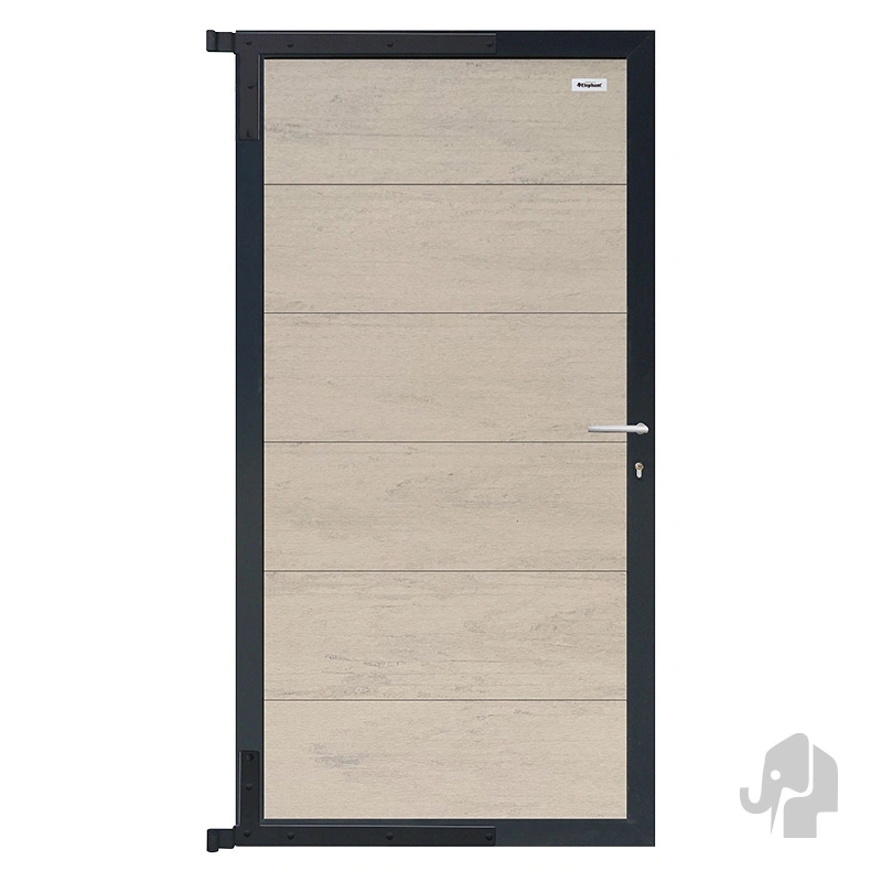 De composiet tuindeur Forte in betongrijs is uitgevoerd met een antracietkleurig aluminium frame en heeft een afmeting van 90 × 180 cm. De deur wordt compleet geleverd met hang- en sluitwerk, slot en bevestigingsmaterialen. Afhankelijk van de montage van het hang- en sluitwerk kan de deur zowel links- als rechtsdraaiend worden geplaatst.