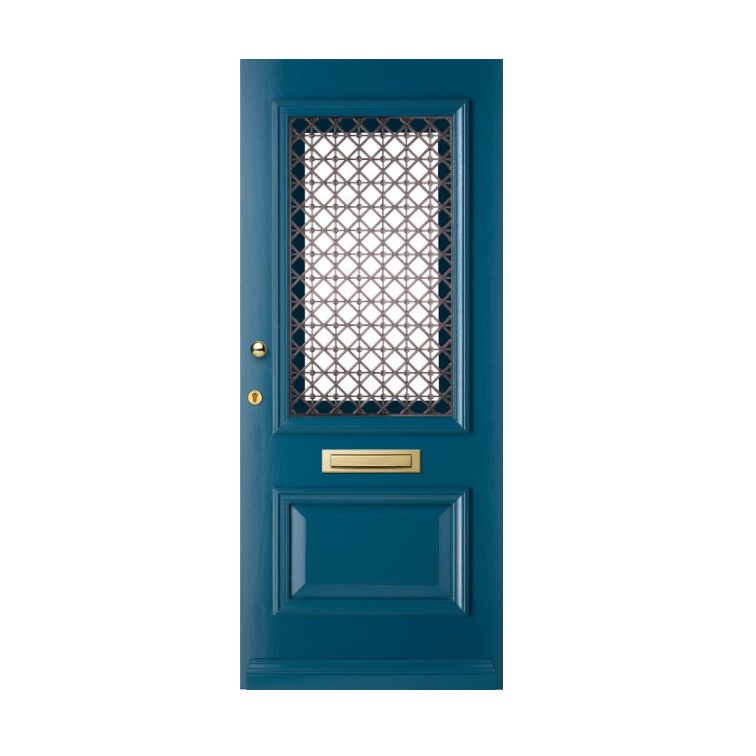 Klassieke hardhouten voordeur met elegant lijstwerk dat vakmanschap en karakter uitstraalt. Uitgerust met een authentiek metalen rooster in lila/grijs, optioneel verkrijgbaar in zwart, wit, groen of zilver. Voorzien van een praktisch draairaam en leverbaar met blank of veiligheidsisolatieglas.