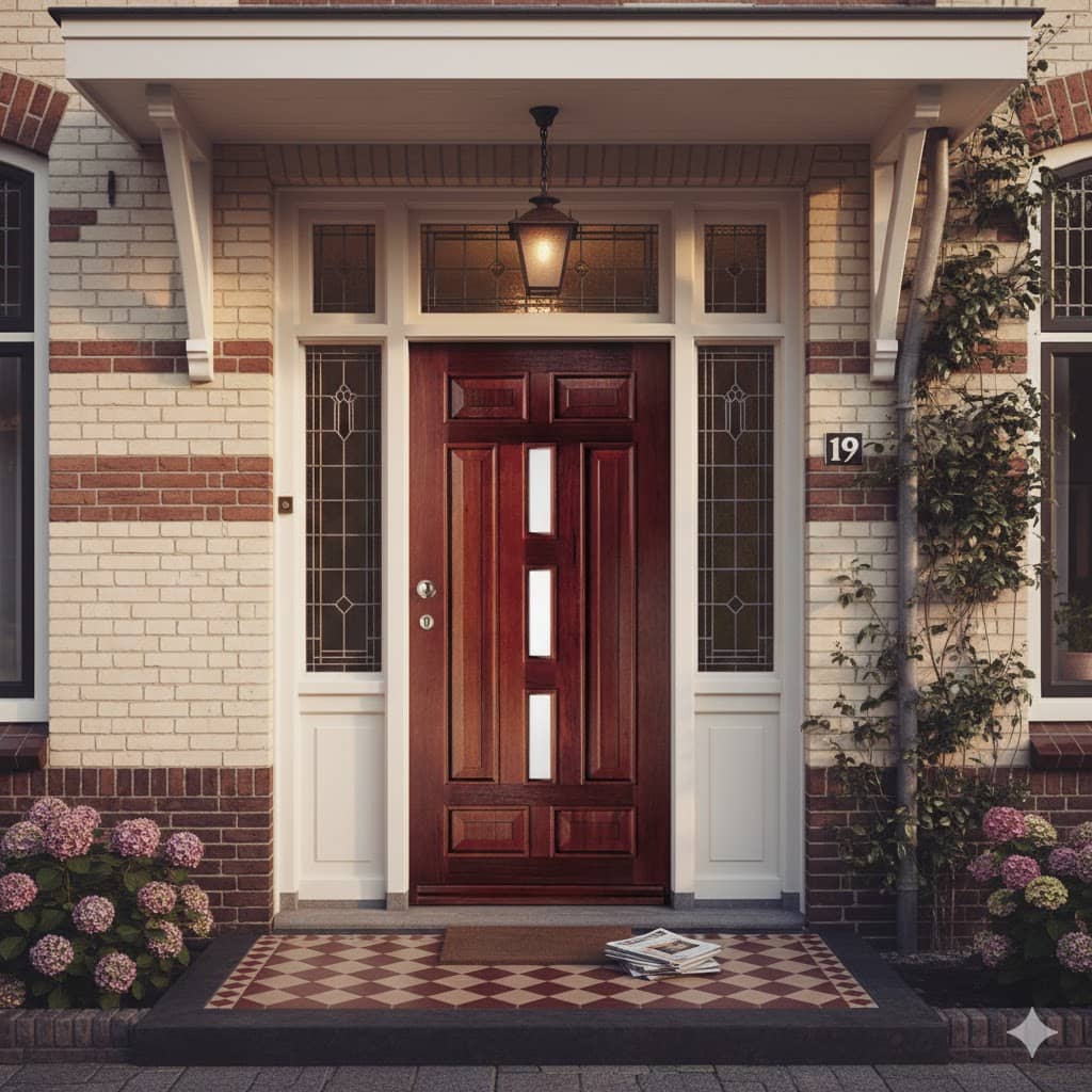 Hardhouten voordeur in authentieke jaren ’30 stijl, voorzien van klassiek glas-in-lood en een karakteristiek boderaampje een herkenbaar detail uit die periode. Standaard geleverd in witte voorlak en op wens volledig af te lakken in elke gewenste kleur, met de mogelijkheid om voor de binnenzijde een andere tint te kiezen. Geen brievensleuf mogelijk. Prijs inclusief glas-in-lood, exclusief beslag, slotgat en hang en sluitwerk.