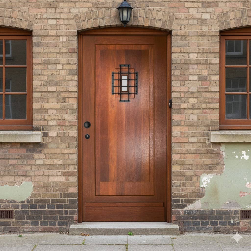 Hardhouten voordeur in authentieke jaren ’30 stijl, met een karakteristiek boderaampje dat zorgt voor extra ventilatie en charme. Het raam is afgewerkt met zwart gemoffelde ijzeren roosters, wat de klassieke uitstraling compleet maakt.