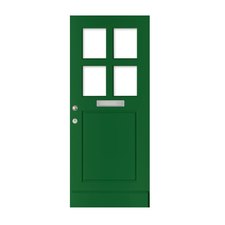 Landelijke hardhouten voordeur met vier ruiten, verkrijgbaar in verschillende glassoorten. Standaard geleverd met witte voorlak en op wens volledig af te lakken in elke gewenste kleur, waarbij binnen- en buitenzijde afzonderlijk kunnen worden uitgevoerd. Prijs exclusief glas, beslag, slotgat en hang en sluitwerk.