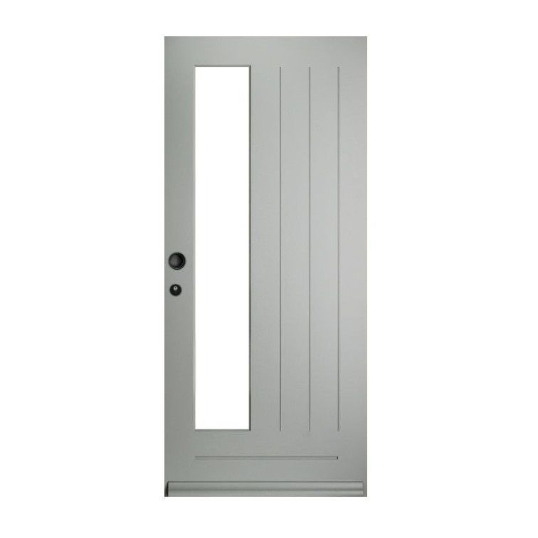 Tijdloze hardhouten voordeur met verticale groeven en een langwerpige ruit voor een elegante, moderne uitstraling. Standaard geleverd in witte voorlak en op wens volledig af te lakken in elke gewenste kleur, met de mogelijkheid om voor de binnenzijde een andere tint te kiezen. Verkrijgbaar met diverse glassoorten. Geen brievensleuf mogelijk. Prijs exclusief glas, beslag, slotgat en hang en sluitwerk.