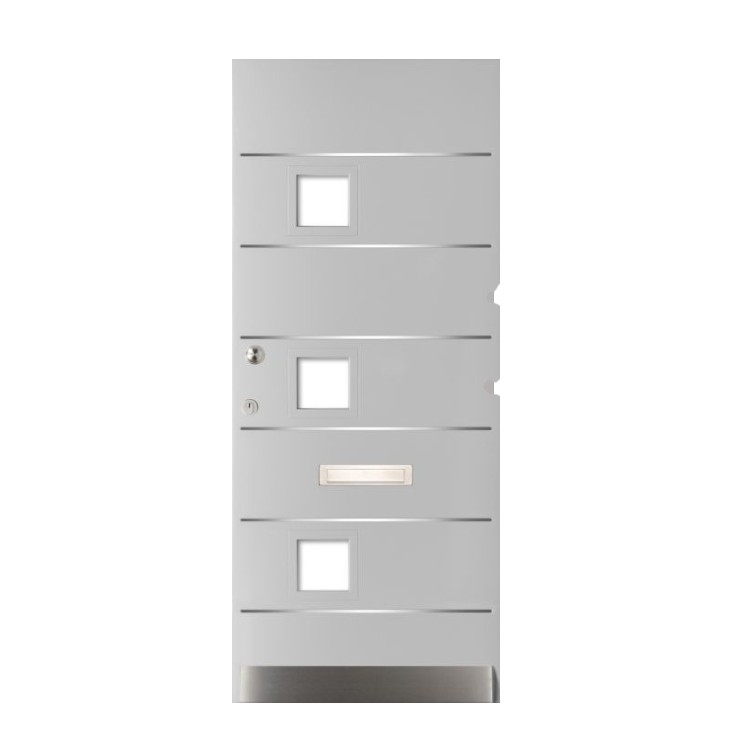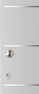Moderne TriComfort® voordeur met een strakke uitstraling, voorzien van een RVS-weldorpel, horizontale RVS-inleg en transparant blank glas. Standaard geleverd in witte voorlak en op wens volledig af te lakken in elke gewenste kleur, met de mogelijkheid om voor de binnenzijde een aparte tint te kiezen. Prijs exclusief glas, beslag, slotgat en hang en sluitwerk.