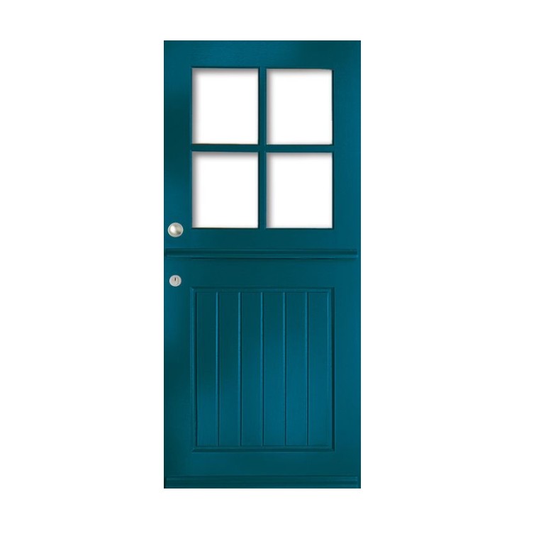Hardhouten duetdeur met vier ruiten, verkrijgbaar in diverse glassoorten. Standaard geleverd met witte voorlak en op wens af te lakken in elke gewenste kleur, waarbij binnen en buitenzijde afzonderlijk gekozen kunnen worden. Prijs exclusief glas, beslag, slotgat en hang en sluitwerk.