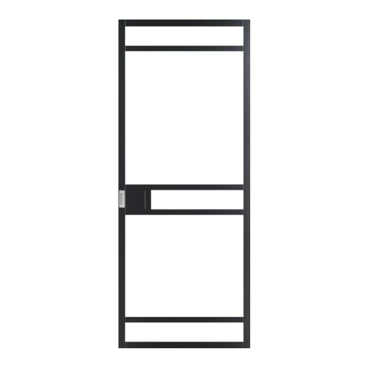 Deze minimalistische binnendeur heeft een strak design met een authentieke industriële look. Het vlakliggende paneel en de 50 mm stijlbreedte maken hem ideaal als schuifdeur zonder slot. Gemaakt van hout met een realistische steel look, standaard zwart gegrond en in elke kleur af te lakken. Inclusief voorgemonteerd veiligheidsglas, exclusief beslag en hang- en sluitwerk.