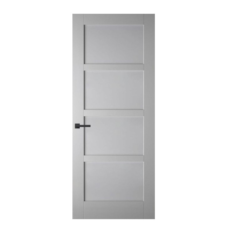 Moderne houten binnendeur met strak recht profiel en een stijlvolle 4-vlaksverdeling met bovenruit. Verkrijgbaar met diverse glassoorten.